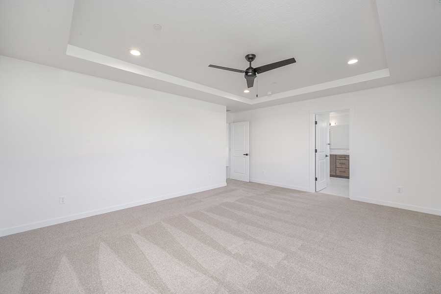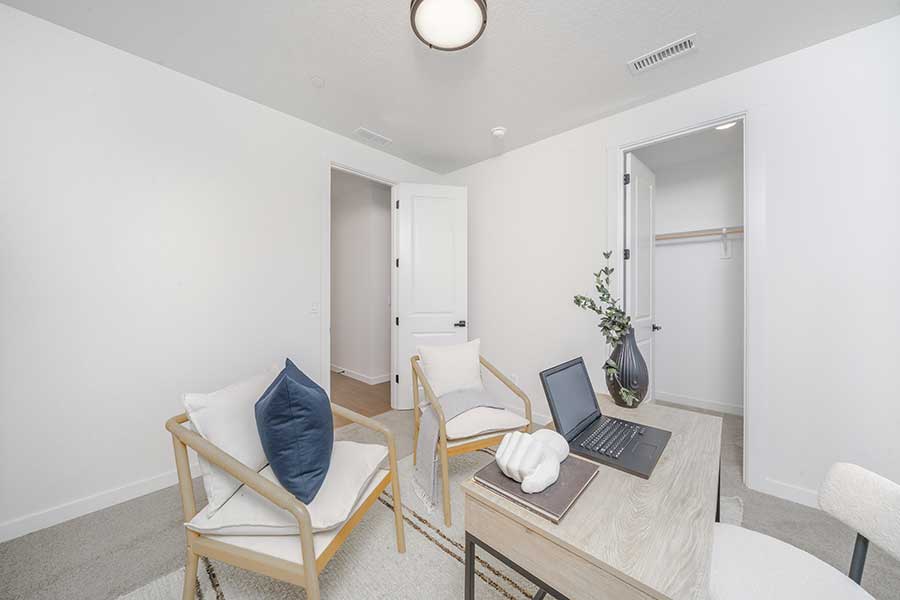 As you go upstairs, you’ll be greeted with an open loft area that can serve as a media or play room, or another office space. The large primary suite located in the back of the home boasts a coffered ceiling, and the bathroom includes a 5 ft tile shower, soaking tub, and walk-in closet with custom shelving. Opposite the primary bedroom are 2 more bedrooms, a full bathroom and a large laundry room that includes a folding counter.
